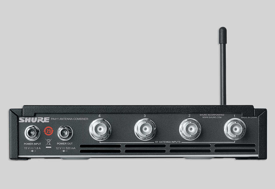 舒爾PA411天線組合器可為最多四個舒爾PSM300發射機分配直流電源和組合射頻信號。在使用多個系統時,緊湊的半機架系統可明顯減少所需天線和電源的數量。