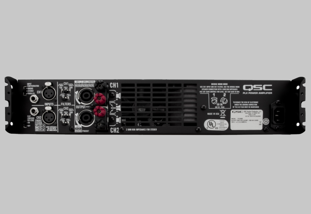 兩個Speakon?NL4輸出連接器提供正鎖定揚聲器連接。上連接器在所有四個電極(通道1:1+,1-;通道2:2+,2-)上提供兩個通道輸出,用于橋接單聲道或用于單電纜連接到雙放大揚聲器。